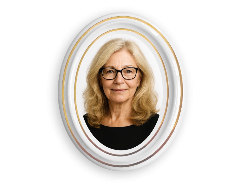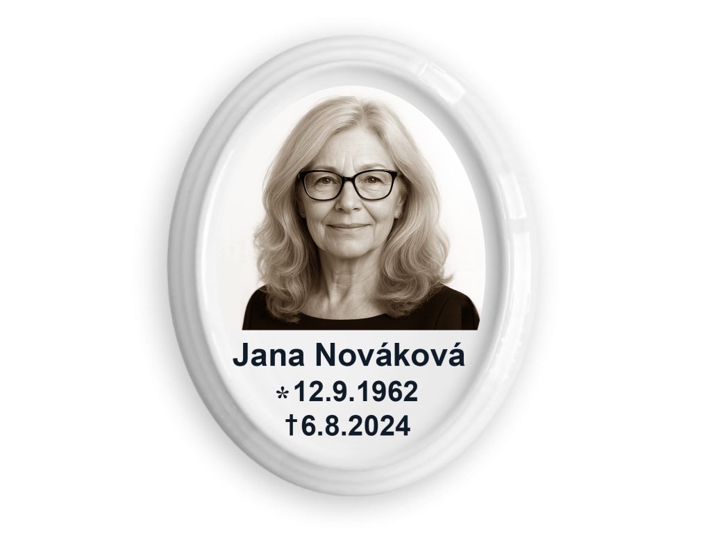 Oválná fotokeramika Bohemia představuje tradiční, ale zároveň velmi estetické provedení vzpomínkového portrétu. Charakteristický bílý reliéfní rámeček dodává keramice jemný dekorativní prvek a podtrhuje důstojnost celého ztvárnění. Fotografie je zapečena do porcelánu při vysoké teplotě, díky čemuž je odolná proti vodě, UV záření i mrazu. Tvar oválu je univerzální a hodí se na většinu náhrobních desek. K dispozici jsou různé velikosti a možnost barevných úprav, včetně retuše či změny pozadí. Fotokeramika Bohemia je vhodná jak pro barevné, tak černobílé fotografie.